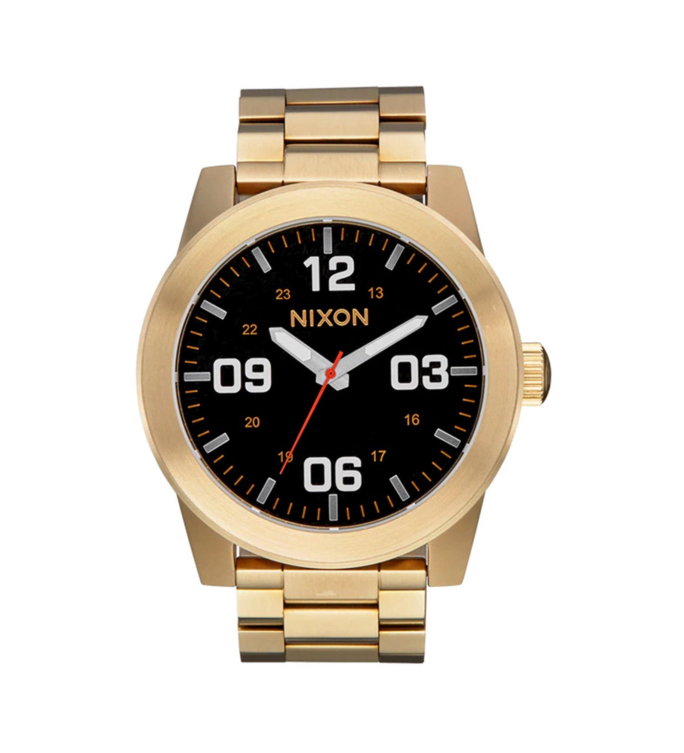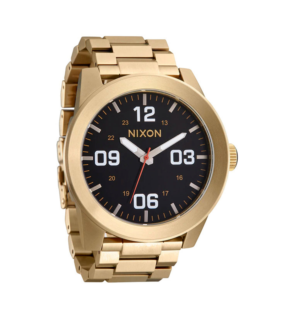 A forceful display of superior style The new stainless steel Corporal SS takes command. Stripped of all but the essential function of keeping true time, the Corporal distinguishes itself as a leader. The strategic blend of high-caliber construction and disciplined design result in a forceful display of superior style. MOVEMENT: Miyota Japanese quartz 3 hand. DIAL: The dial includes military inspired bold printed indices and numbers, a printed seconds track and custom molded hands with luminous fill. CASE: 48mm, 100 meter/ 10ATM custom solid stainless steel case with a solid stainless steel fixed bezel, hardened mineral crystal, triple gasket crown with enamel fill, stainless steel screw down caseback and spring pin lugs. BAND: 24mm custom solid stainless steel faceted 3 link bracelet with a stainless steel double locking clasp with micro adjust.