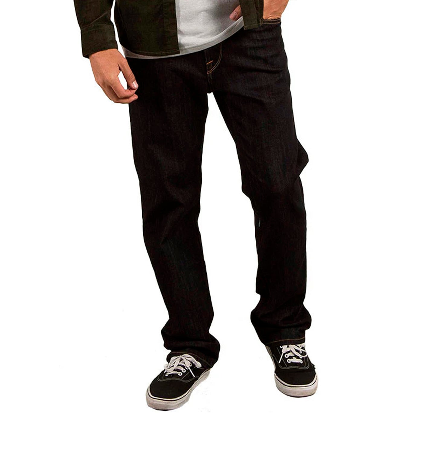 - Men's denim pants are classically styled with a regular fit and a regular rise