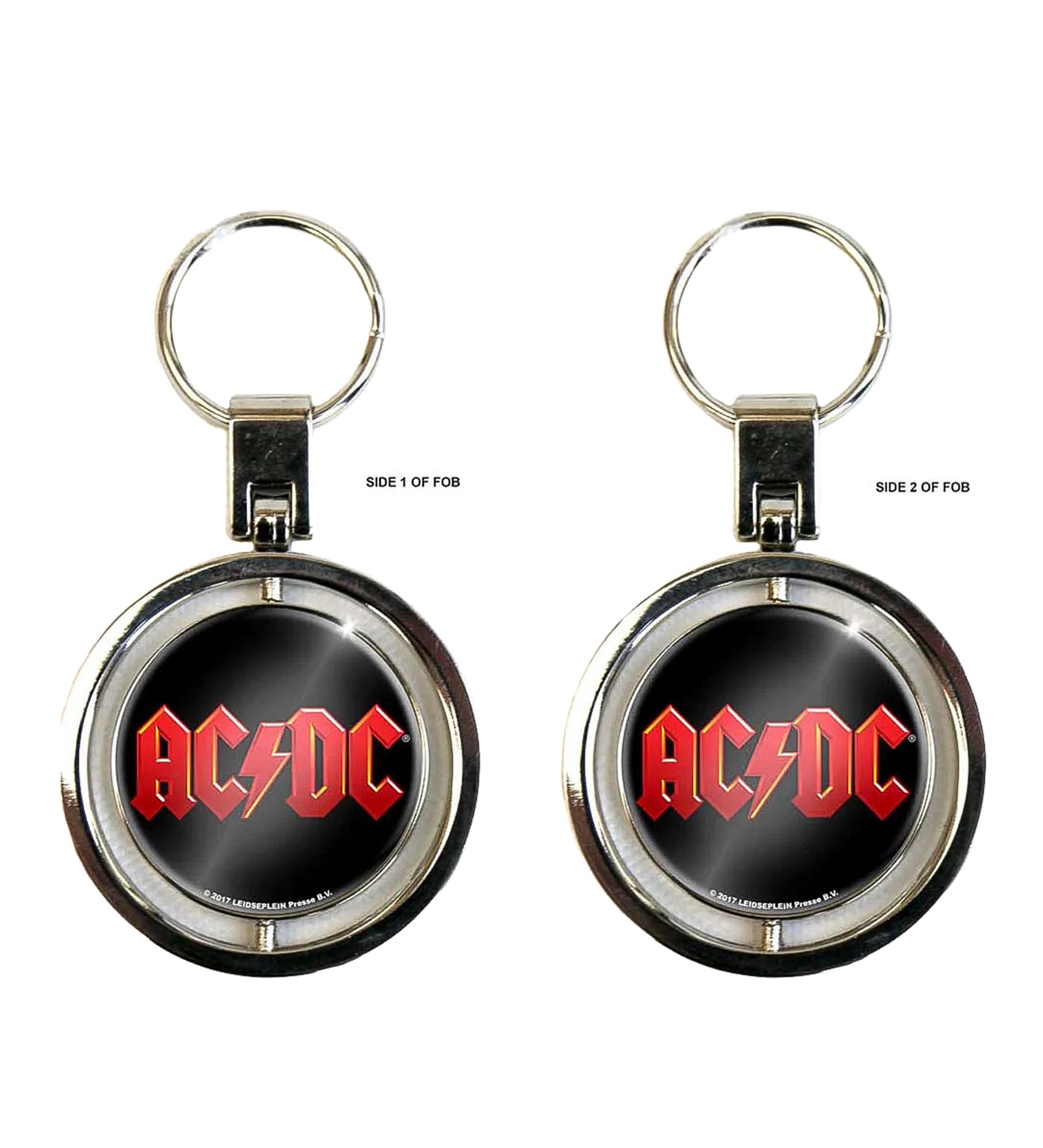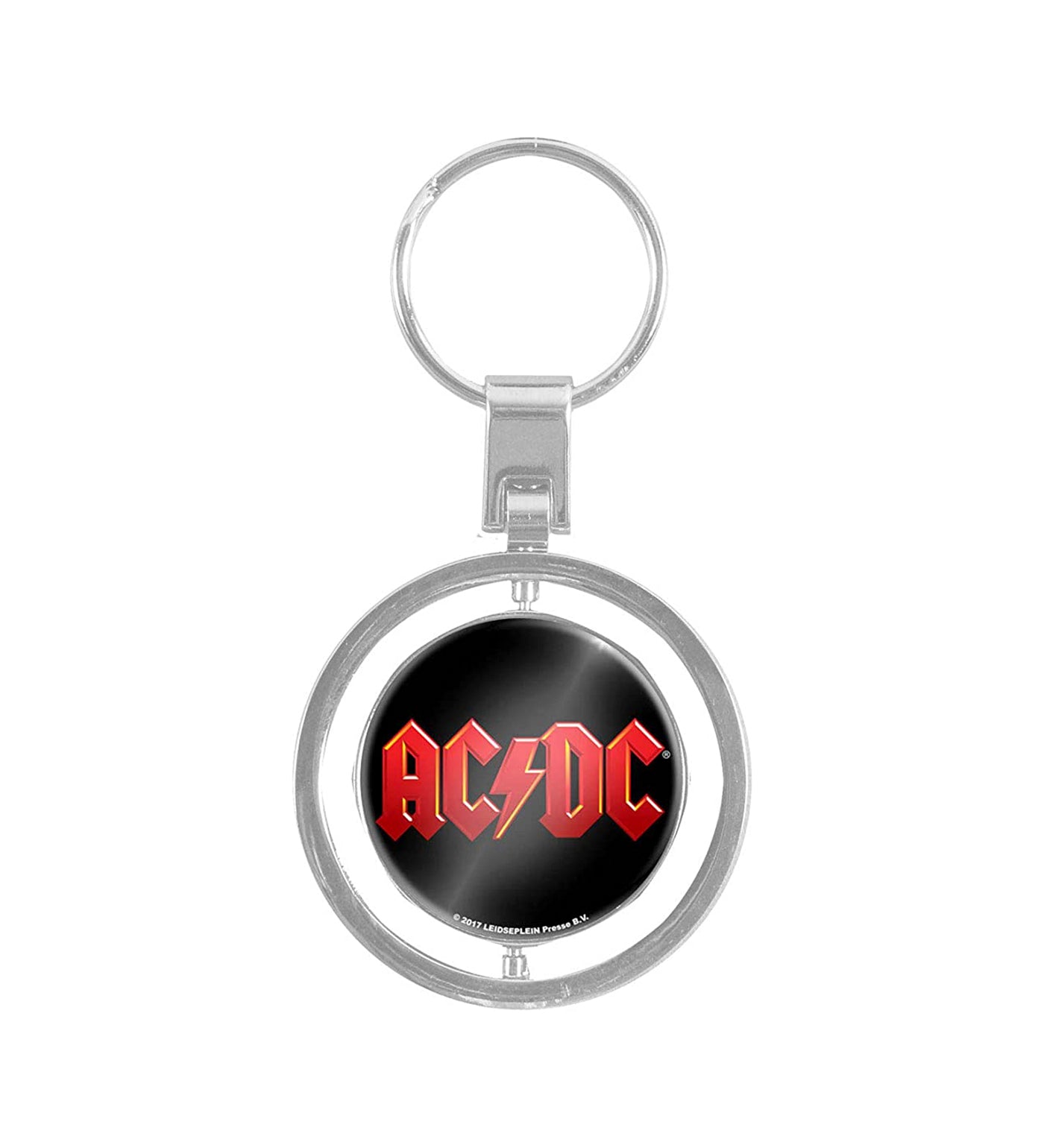An official licensed Keychain featuring the AC/DC 'Logo' design motif. Extreme high quality metal die-cast spinner keyring with double sided photo print image and epoxy covering.