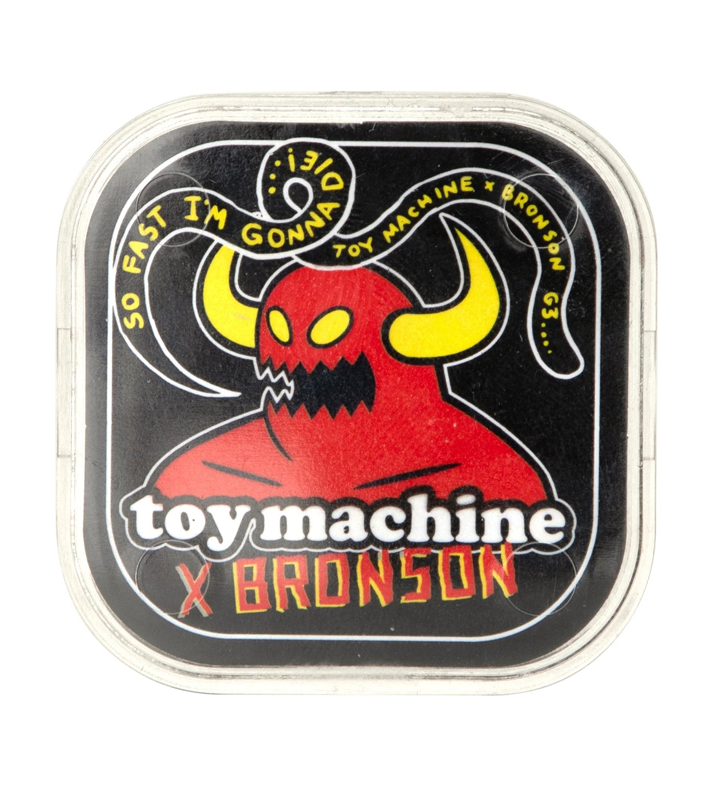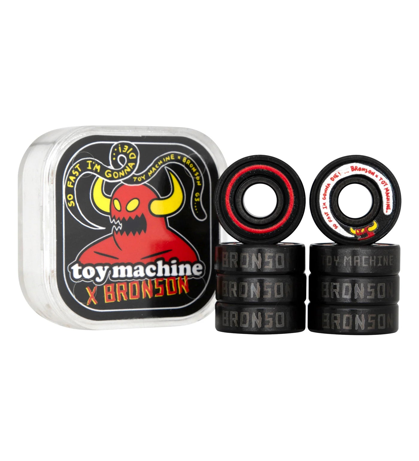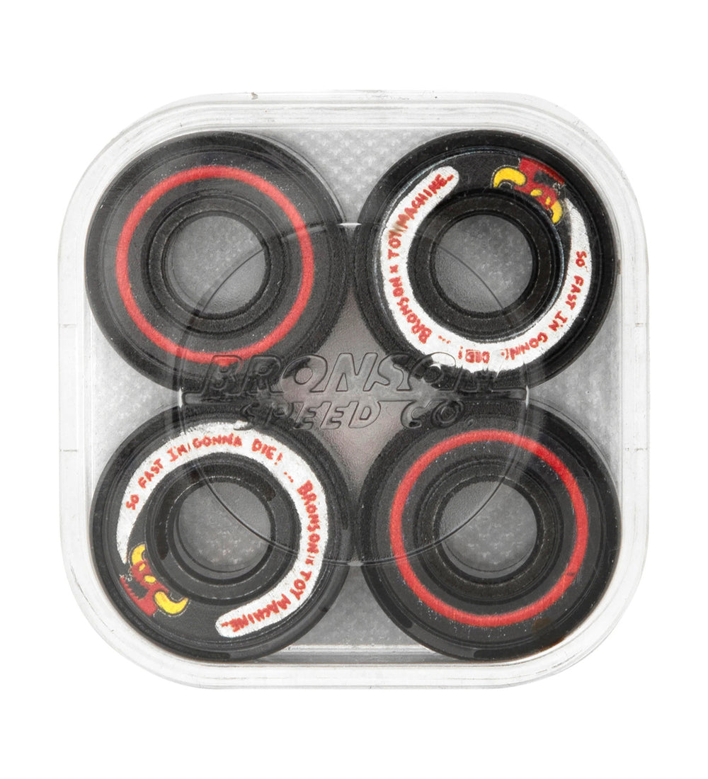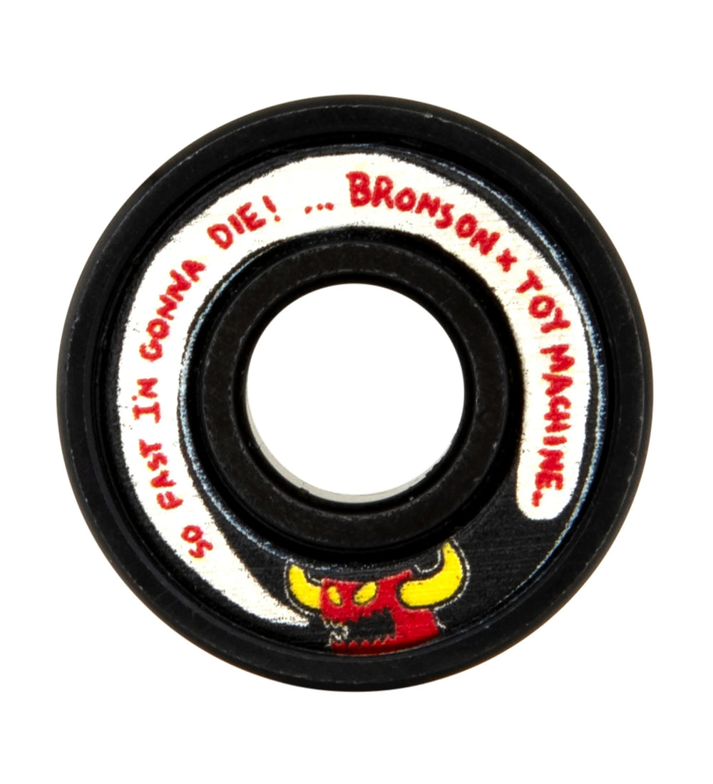 Bronson Speed Co X Toy Machine Bloodsucking Skateboard Company G3 Bearings featuring super durable printed shields with "SO FAST I'M GONNA DIE!" graphics and 7 BRONSON, 1 TOY MACHINE font laser etched logos on black coated bearing races.